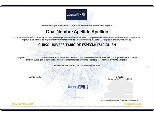 Nuestros cursos universitarios cuentan con el respaldo académico de la Universidad Europea de Gasteiz EUNEIZ, que otorga las titulaciones y supervisa todo el proceso de control universitario. La Universidad EUNEIZ fue reconocida oficialmente como universidad privada el 11 de noviembre de 2021, mediante la Ley 8/2021 del Parlamento Vasco, publicada en el BOPV el 22 de noviembre de 2021 y en el BOE el 16 de diciembre de 2021.